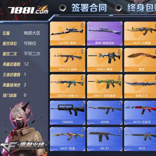 【不可二次 英雄武器数量:12 英雄角色数量:2 王者武器数量:1 岚兮儿,战地猎狐 修罗-CFSTAR,天龙-CFSTAR,无影-神兵利器,AK47-B-常胜将军-曹操 稀有武器:1个 爆破号】